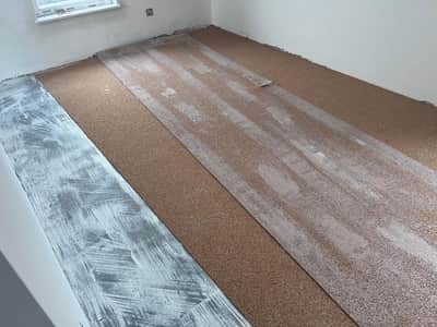 Enduisez le liège et le sol de colle de contact Wakol. Laissez bien sécher (minimum 20 minutes à température ambiante).